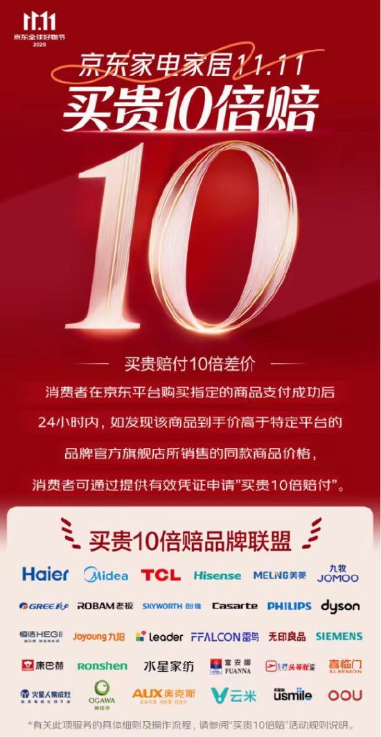 业内人士认为,京东家电家居选在某平台双11正式开启的前一天上线“买贵10倍赔”,被业内视为对友商的“精准狙击”,更折射出其深耕低价战略、以供应链优势重构行业规则的野心。